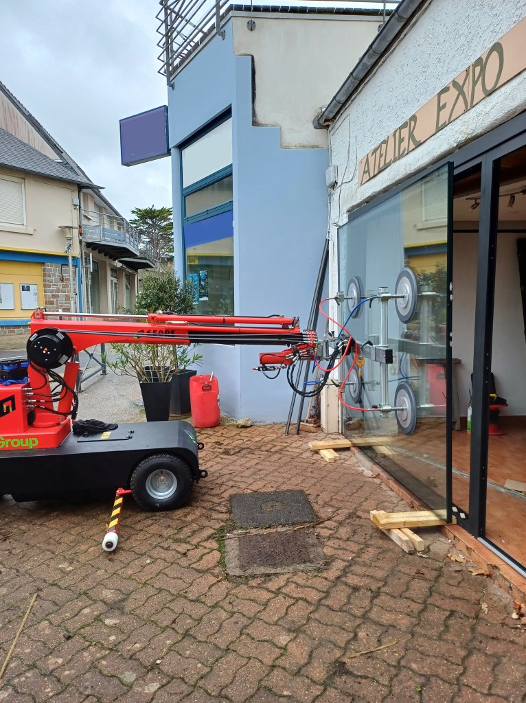 Pose de vitrages lourds à l’aide de la mini grue à ventouses