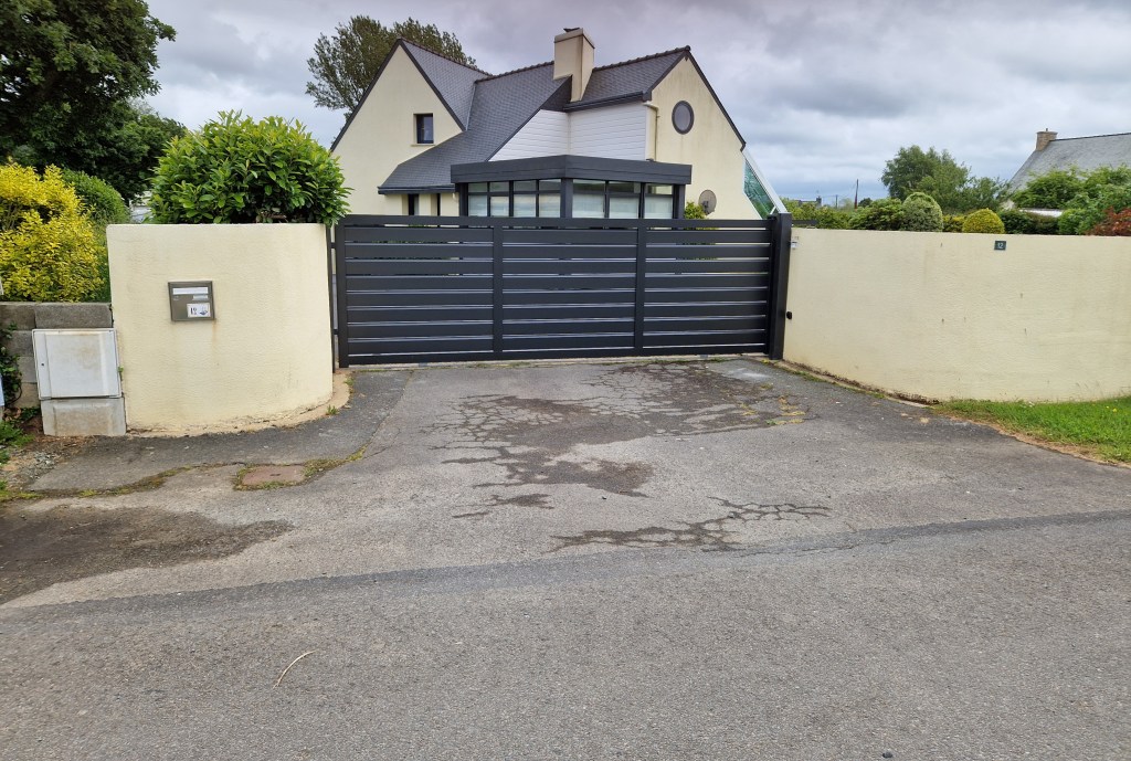 Portail coulissant en aluminium Remplissage horizontal lames à clair voie Noir sablé